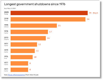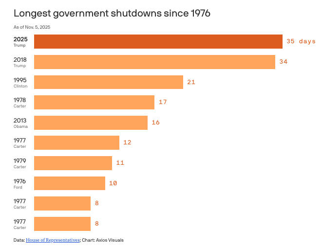 Trump breaks his own record for the longest government shutdown in history 52% of voters blame Trump and congressional Republicans for the continued stalemate, according to an NBC News poll released on Sunday. 42% blame Democrats in Congress and 4% blame all of the players. Threat level: Each week of the shutdown could cause a $7 billion hit to the U.S. economy, according to an EY-Parthenon estimate. Office of Management and Budget director Russell Vought foreshadowed firing between 4,100 and 10,000 employees across several agencies, and while the Trump administration followed through on threats to slash the workforce, a federal judge temporarily blocked the layoffs. ... Read more Documents reveal chaos and confusion behind government shutdown layoffs Layoffs are never a painless exercise, but the Trump administration's effort to fire federal workers while the government is shut down is driving confusion and chaos beyond a typical termination, court filings show. Why it matters: Documents from a federal court case challenging shutdown firings detail an unusual mess in the latest setback for federal workers this year. Catch up quick: In early October, while agencies were shuttered, and many on furlough - not working, not getting paid - firing notices went out to about 4,000 people. ... ... ... Read more New gig alert: Training our robot replacements As layoffs mount, training AI is becoming a lucrative new side hustle - even if it means helping build the model that could one day replace you. The big picture: The AI giants desperately need money, energy and data. They also need people. At least for now. When CEOs promise humans will stay "in the loop", it's unclear if that means to make big consequential decisions, simply review AI's work, or take the wheel in case of emergency. Right now humans are still a key part of that loop, acting as the mechanical turks of generative AI's magic. Like the 18th-century chess automaton secretly steered by a hidden master, today's "AI trainers" perform unseen labor to make machines appear smarter than they are. Humans select, clean and label data to fine-tune AI models, teaching them how to answer questions or understand images. ... Read more