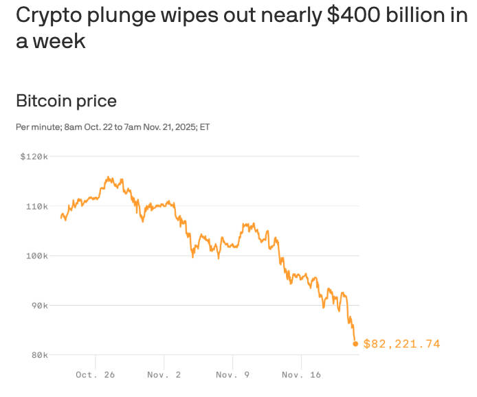 Crypto plunge wipes out nearly $400 billion in a week A plunge in cryptocurrency assets accelerated Friday morning, led by bitcoin, which has lost more than a third of its value since setting an all-time high in October. Why it matters: The bloodbath has left no corner of the market untouched, and is reviving the debate about crypto as a long-term asset. By the numbers: Bitcoin fell as low as $81,919 early Friday, per CoinGecko data, off more than 10% in 24 hours to the lowest levels since April. In early October the original cryptocurrency set a record when it broke $126,000 for the first time. Bloomberg reported the coin is on track for its worst month since June 2022, which was a catastrophic period for the industry. ... Read more
