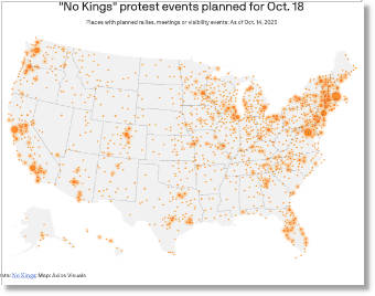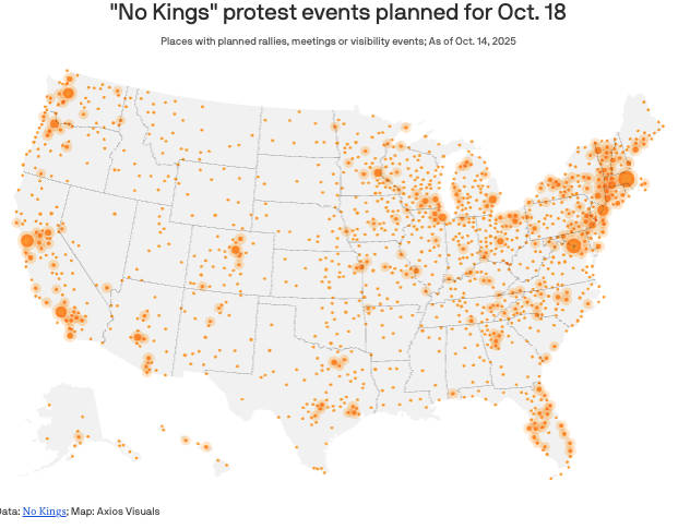 What to know about Oct. 18 "No Kings" protests No Kings protest organizers expect millions to gather across the nation on Saturday, Oct. 18 in an event Republican lawmakers decry as a "a hate America rally." Why it matters: The latest round of protests comes amid growing frustration about the ongoing government shutdown and widespread opposition to President Trump's military crackdown on Democratic-led cities across America. State of play: More than 2,500 events are planned across all 50 states as of Monday, organizers said. "Together, millions will send a clear and unmistakable message: we are a nation of equals, and our country will not be ruled by fear or force," their statement said. Participating groups include the American Civil Liberties Union, American Federation of Teachers, 50501, Human Rights Campaign, Indivisible and MoveOn. ... Read more