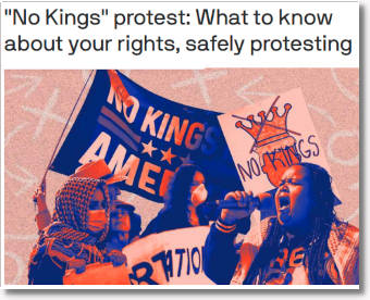 "No Kings" protest: What to know about your rights, safely protesting Millions are expected to protest nationwide this weekend for "No Kings Day," raising questions about how to demonstrate safely amid President Trump's law enforcement crackdowns. The big picture: While most "No Kings" protests in June were peaceful, scattered incidents of violence in Los Angeles, Salt Lake City and Culpeper, Virginia have renewed focus on protest preparation and demonstrators' rights. ... Read more No Kings protest "Know your rights to protest safely".pdfClick to read PDF |