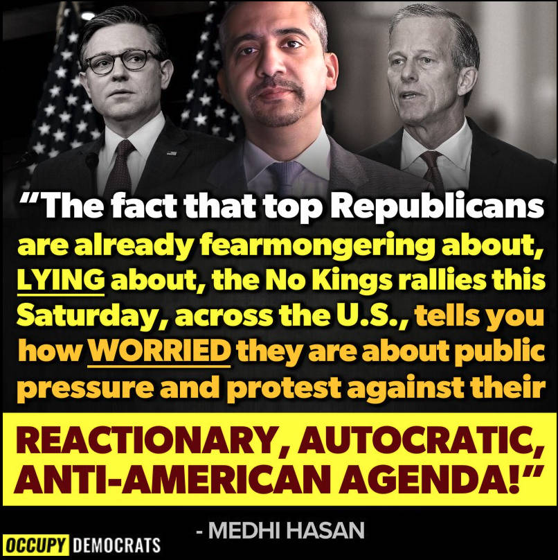House Speaker Mike Johnson (R-La), in a Fox News appearance, said the protests were being put on by "the pro-Hamas wing and the Antifa people." House Speaker Mike Johnson (R-La.) and House Majority Leader Steve Scalise (R-La.), called the protest "a hate America rally." Mike Johnson (R-La.), "It's being told to us that they won't be able to reopen the government until after that rally because they can't face their rabid base," White House spokesperson Abigail Jackson said in a statement. "Left-wing protestors can beclown themselves by lawfully protesting the alternate reality they live in." Reality check: Johnson canceled a third week of House votes amid the ongoing shutdown. Zoom in: "Speaker Johnson is running out of excuses for keeping the government shut down," No Kings organizers said. "Instead of reopening the government, preserving affordable healthcare, or lowering costs for working families, he's attacking millions of Americans who are peacefully coming together to say that America belongs to its people, not to kings." Sen. Chris Van Hollen (D-Md.) said on Bluesky he looked forward to No Kings Day, saying the GOP was "the same kind of weasels who would've called George Washington & America's revolutionaries 'terrorists.'" He wrote that Republicans "spend their days sucking up to King Trump & demonizing peaceful protest just as some in America sought to appease King George III." 2025's big ad spender: The U.S. taxpayer The most expensive political ad campaign of the year is being run by the Department of Homeland Security. Why it matters: DHS disputes that its ads are political. But it has spent at least $51 million this year on ads thanking President Trump for securing the border, according to AdImpact.
