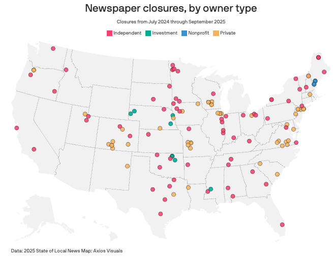 Independent newspapers disappear as private investment firms take over Newspapers owned by small, independent groups - often families or businesses invested in their local communities - are shuttering at an alarming pace compared to those owned by large investment companies, according to a new report from Northwestern's Medill School of Journalism. Why it matters: Independent newspapers are more likely to represent rural communities that are at greater risk of becoming "news deserts," or areas with extremely limited or zero access to local news sources. Zoom in: The erosion of small, independent newspapers means that the majority of remaining papers in the U.S. will be even more heavily concentrated among larger hedge funds and private-equity-backed groups that tend to be less invested in local communities. "The scary thing about that is that those are the owners that have been doing it, many cases, for decades," said Tim Franklin, a senior associate dean, professor and John M. Mutz Chair in Local News at Medill. "They're the most passionate about their publications, and even those folks are beginning to throw up their hands." ... Read more |