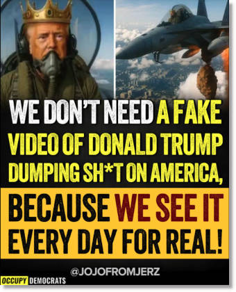 Rump dropping his poop on 'No Kings Day' protesters | https://ca.news.yahoo.com/donald-trump-posts-ai-video-130927814.html |
