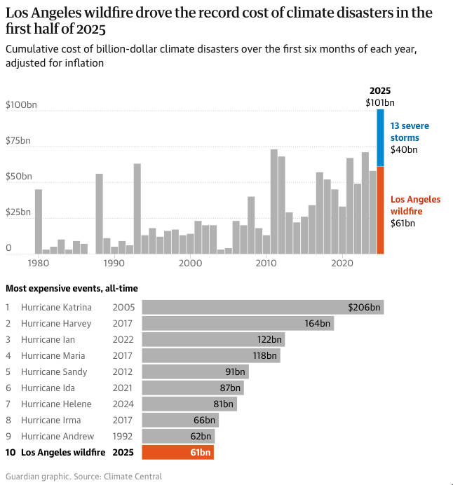 Climate disasters in first half of 2025 costliest ever on record, research shows LA wildfires and storms this year cost $101bn, new study by non-profit resurrecting work axed by Trump says The first half of 2025 was the costliest on record for major disasters in the US, driven by huge wildfires in Los Angeles and storms that battered much of the rest of the country, according to a climate non-profit that has resurrected work axed by Donald Trump's administration that tracked the biggest disasters. In the first six months of this year, 14 separate weather-related disasters that each caused at least $1bn in damage hit the US, the Climate Central group has calculated. In total, these events cost $101bn in damages - lost homes, businesses, highways and other infrastructure - a toll higher than any other first half of a year since records on this began in 1980. The bulk of this toll was caused by the ferocious wildfires that razed parts of Los Angeles in January, a disaster that destroyed about 16,000 buildings and resulted in the indirect deaths of around 400 people. At $61bn in damages, the LA fires are one of the most expensive climate-related disasters on record in the US, and the only top 10 event that is not a hurricane. ... Read more |