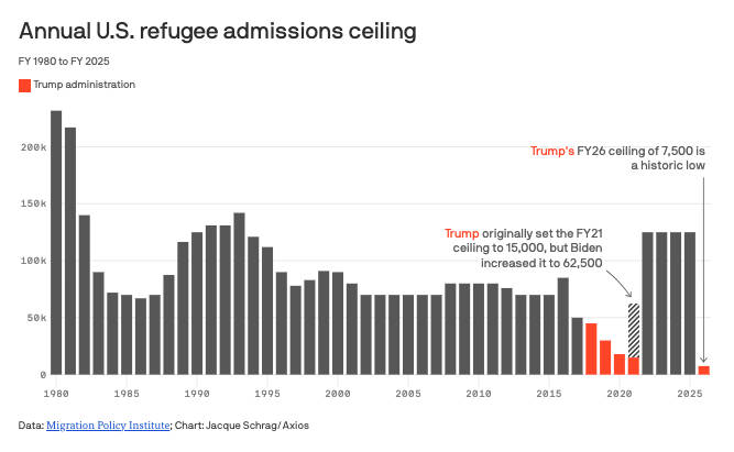Why has the shutdown gone 31 days? Look at Mark Warner. The Virginia Democrat used to be a reliable participant in bipartisan Senate talks. This time, he doesn't see the point. Not so long ago, if there was a bipartisan group getting together to solve a problem in the Senate, you could count on Mark Warner to be involved. The Virginia Democrat was part of the "talking stick" gang that helped quickly end a brief 2018 funding lapse. He was a part of a crew that helped cut a major infrastructure deal under former President Joe Biden, and he's currently working with Republicans to forge an agreement on cryptocurrency regulation. But as his colleagues hunt for a way out of the 31-day-and-counting government shutdown, Warner this time is hanging on the sidelines. It's a twist not only because of Warner's history as a card-carrying bipartisan "gang" member who would frequently host gatherings at his Old Town Alexandria home. It’s also because of who he represents: His home state has the third-highest number of civilian government workers, plus tens of thousands more in military uniforms. Lawmakers from the Washington area have historically been voices of moderation urging both parties to avoid brinkmanship that could harm the federal workforce. ... Read more Trump muddles nuke-testing message President Trump's post announcing the U.S. would resume nuclear testing featured some inaccuracies, and introduced quite a bit of uncertainty. Why it matters: Nuclear rhetoric is closely scrutinized - by governments, by defense contractors, by outside analysts - and can have unintended consequences. Trump's Truth Social shocker will have generated significant debate in Moscow and Beijing over the past 24 hours. Reality check: Trump began his announcement by claiming the U.S. has more nukes than any other country. Russia, in fact, has the largest stockpile. ... Read more Trump sets lowest-ever refugee cap. See how other presidents compare. The Trump administration won't allow more than 7,500 refugees to enter America in FY2026, a record-low cap that prioritizes admitting Afrikaners, or white South Africans, into the country. Why it matters: The plunge cements the president's sharp pivot away from America's historic refugee policies and stands in stark contrast to the 125,000 refugees admitted under the last year of the Biden administration. What they're saying: "The Trump administration has long expressed its intention to end Biden's abuse of the refugee program," a senior administration official told Axios in an emailed statement. ... Read more